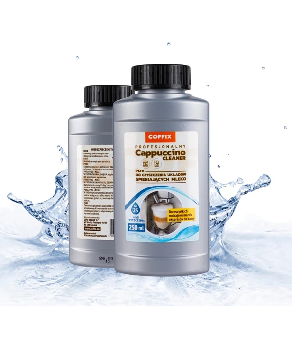 Profesjonalny płyn do czyszczenia systemu mlecznego w ekspresach do kawy – przystawek cappuccino, pojemników na mleko, karafek, chłodziarek do mleka i rurek łączących, przez które przepływa mleko. Rozpuszcza pozostałości zaschniętego mleka, osady mleczne oraz zawarte w nich bakterie, a także usuwa nieprzyjemne zapachy.