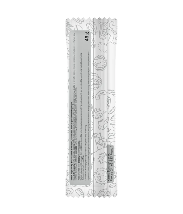 Składniki: migdały 25 %, orzeszki ziemne 23 %, miód, czekolada mleczna 15 % (cukier, tłuszcz kakaowy, mleko w proszku pełne, miazga kakaowa, emulgator: lecytyny z soi, ekstrakt z wanilii), izolat białka sojowego 11 %, syrop ryżowy, proso ekspandowane, siemię lniane, sól.